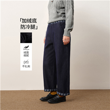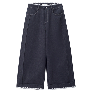 【網上獨家】女裝拼色摺腳高腰闊腿牛仔長褲