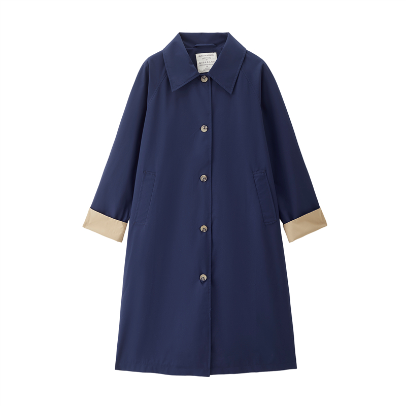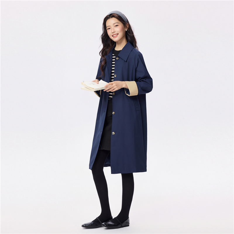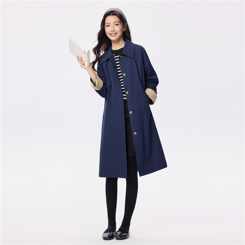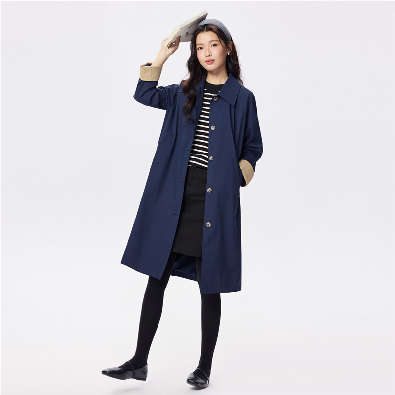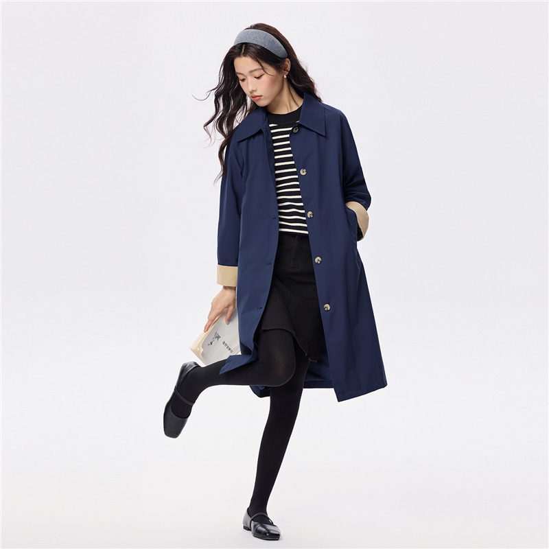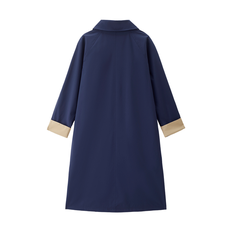【網上獨家】女裝翻領撞色袖裏中長款風外套