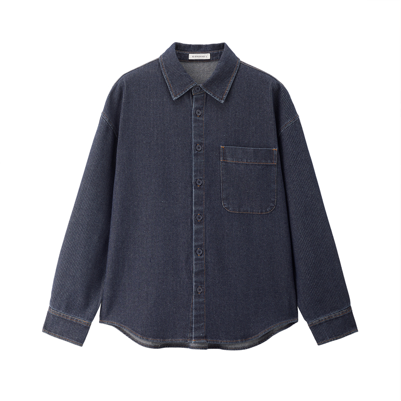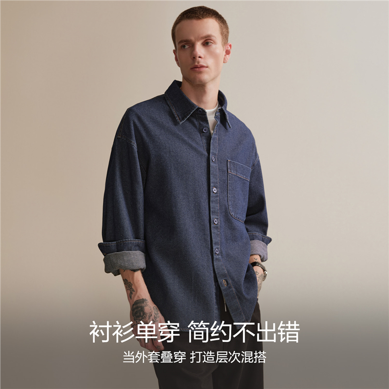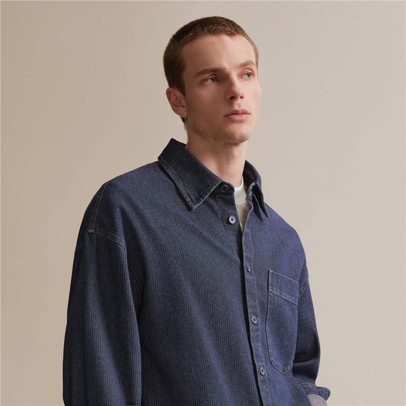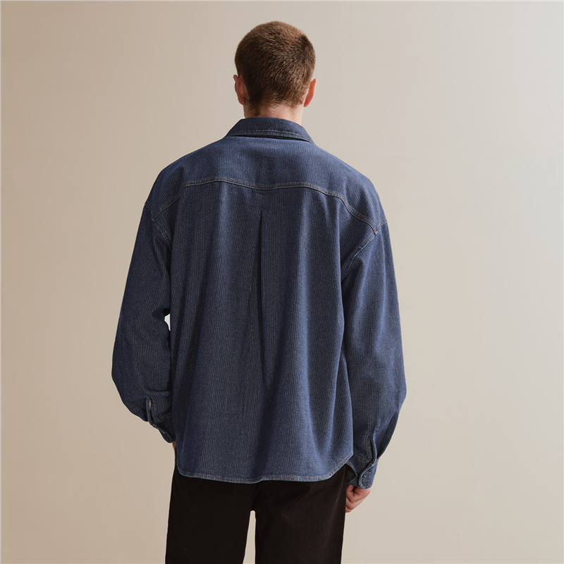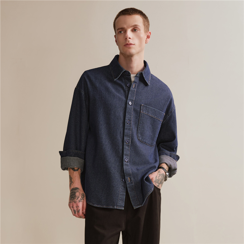 【網上獨家】男裝洗水坑條單口袋寬鬆長袖牛仔襯衫
