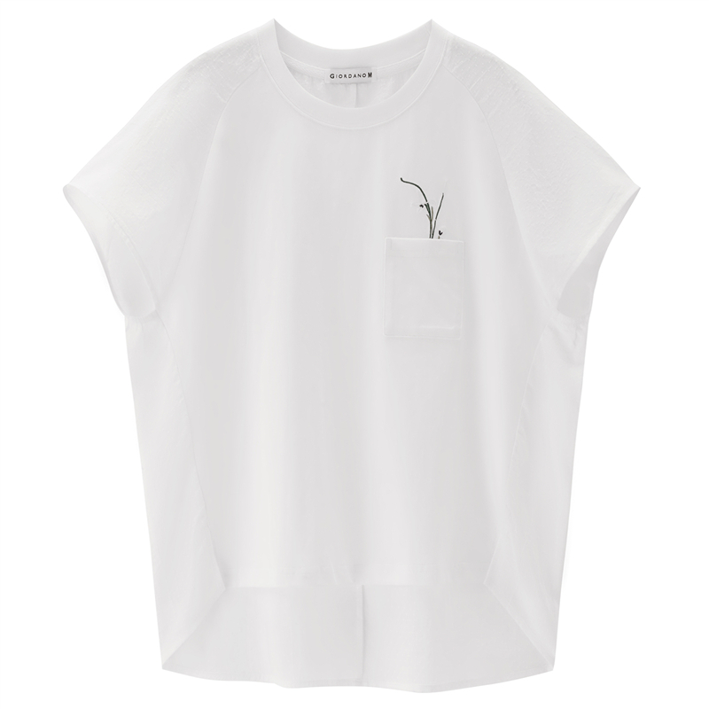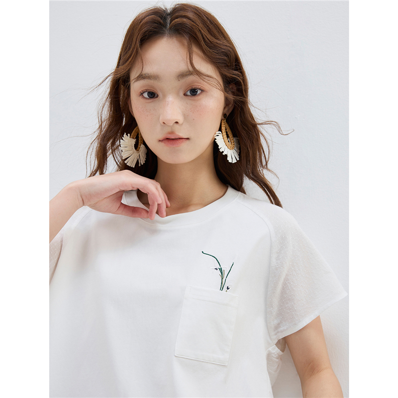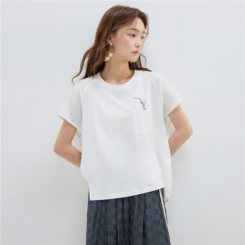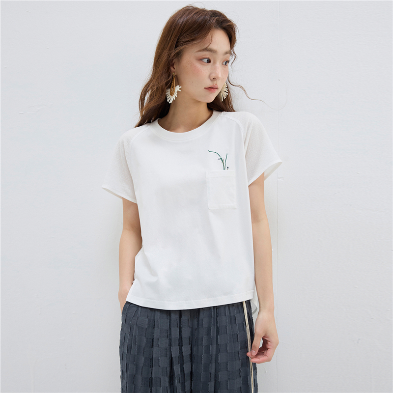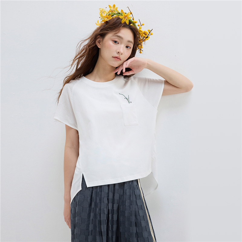 【網上獨家】女裝拼布繡花口袋圓領插肩短袖T恤