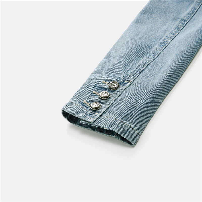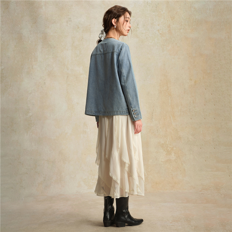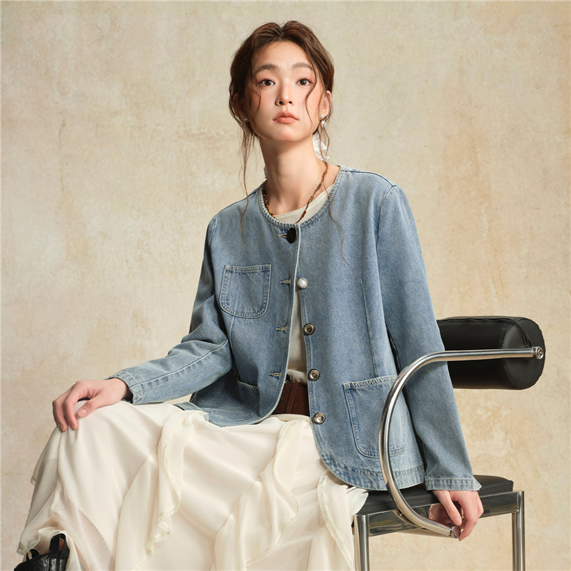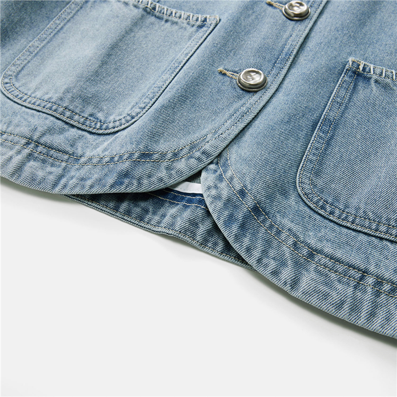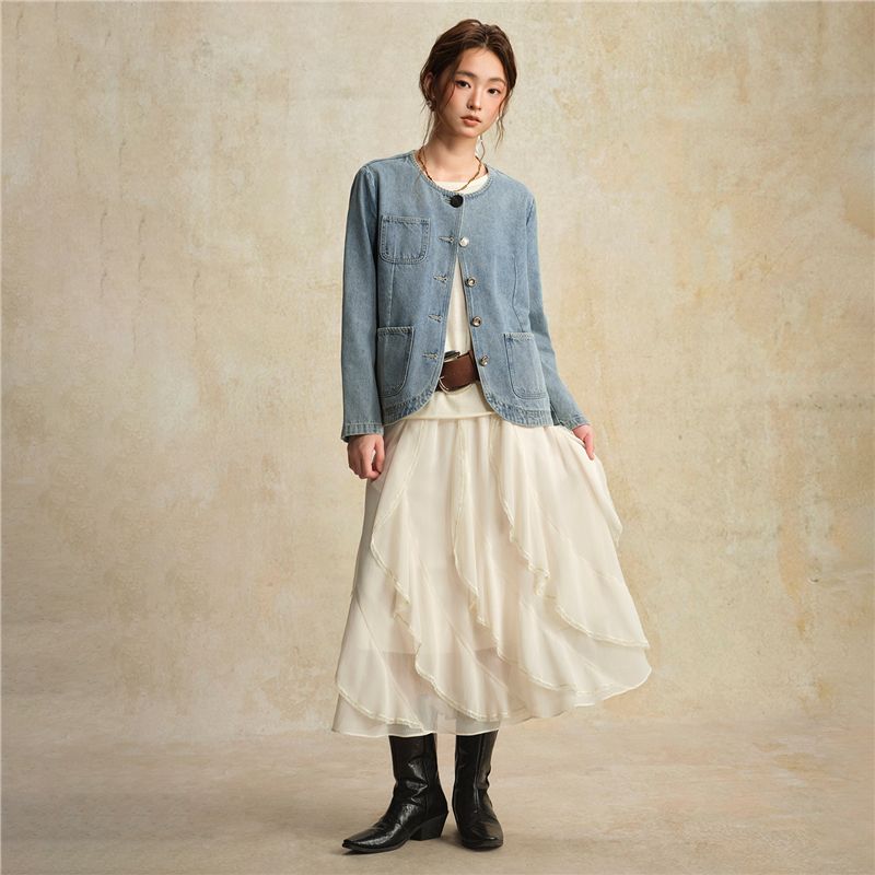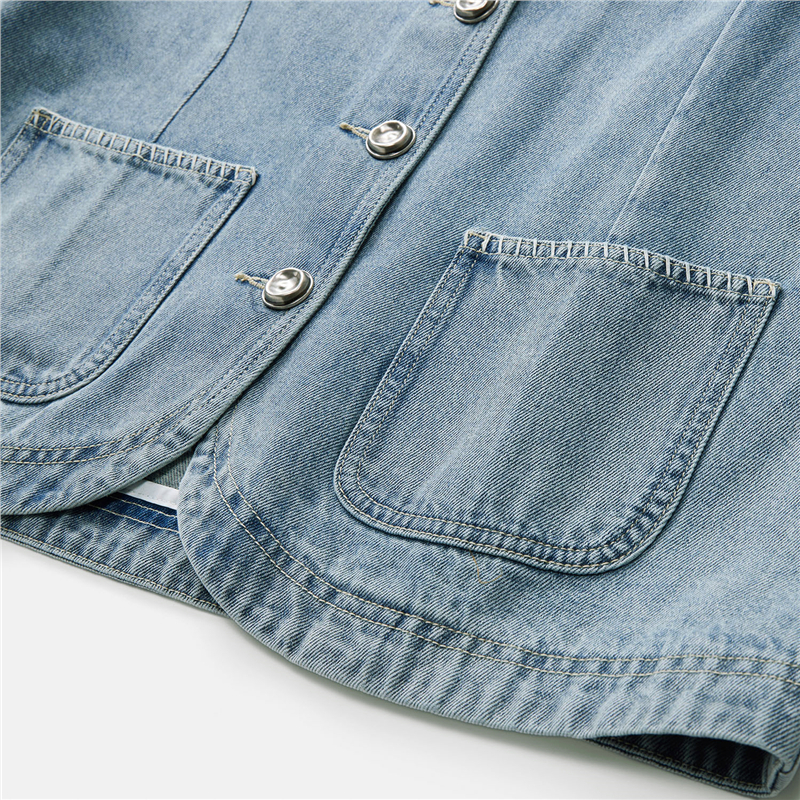 【網上獨家】女裝圓領多口袋不規則鈕扣牛仔外套