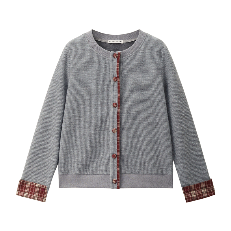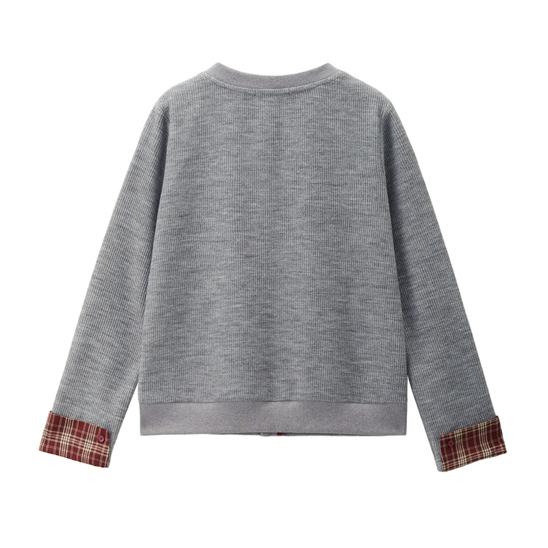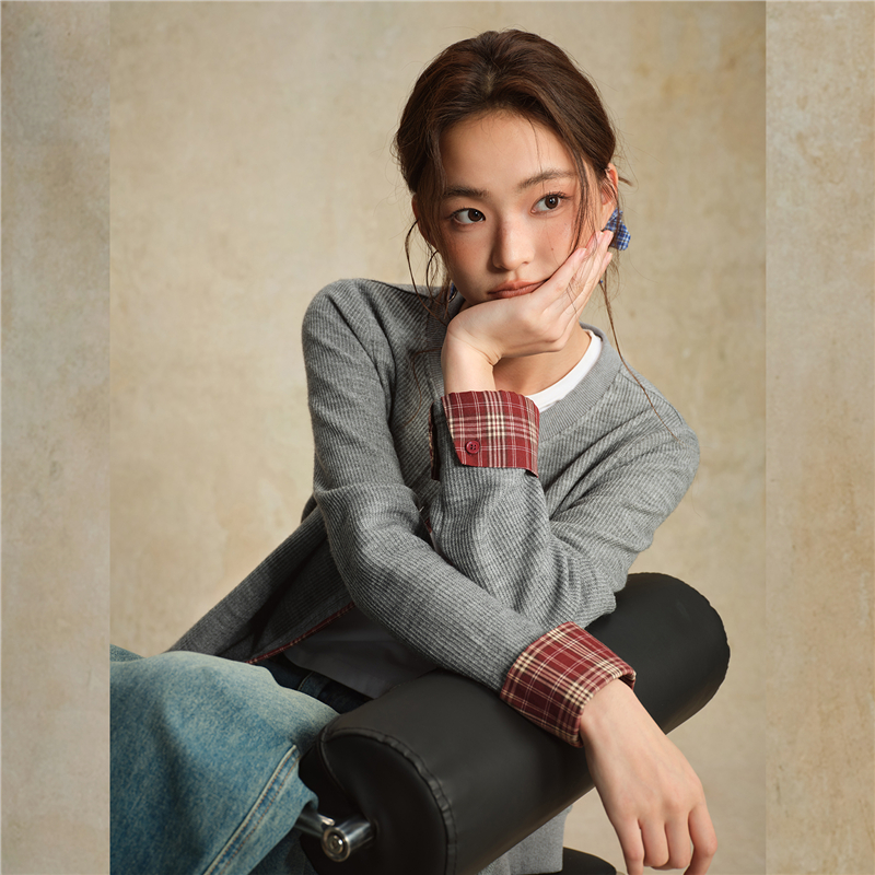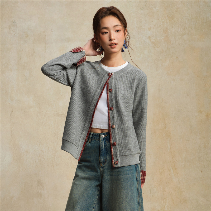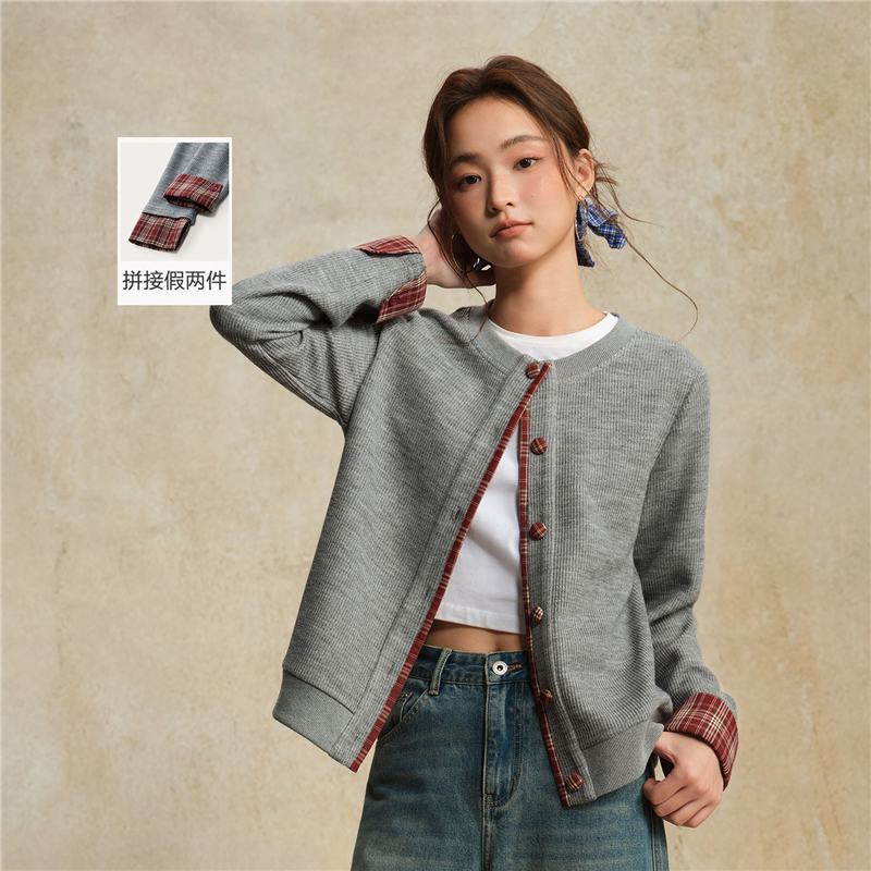 【網上獨家】女裝假兩件針梭織拼接格紋圓領外套