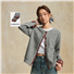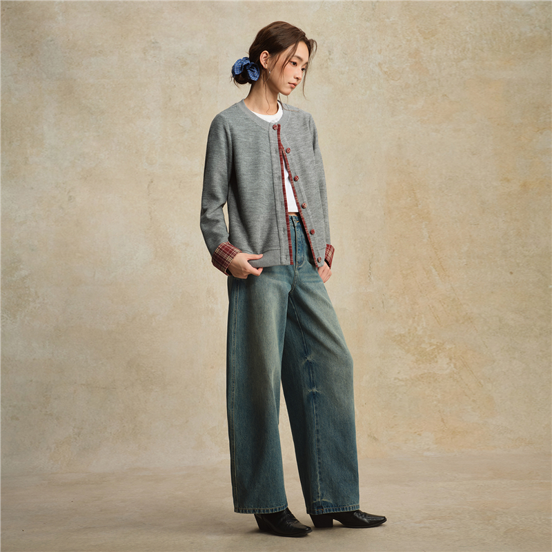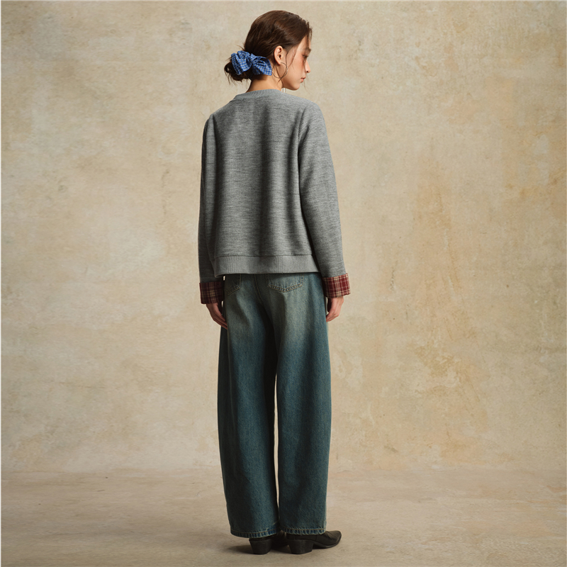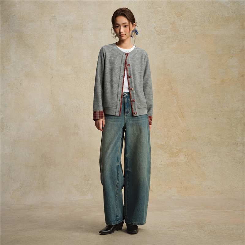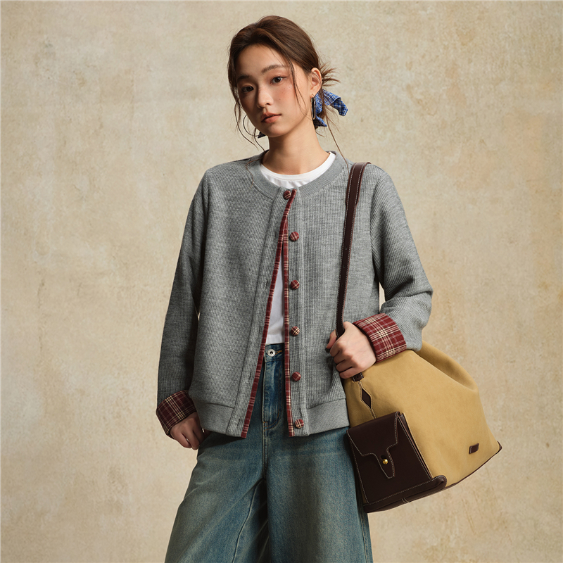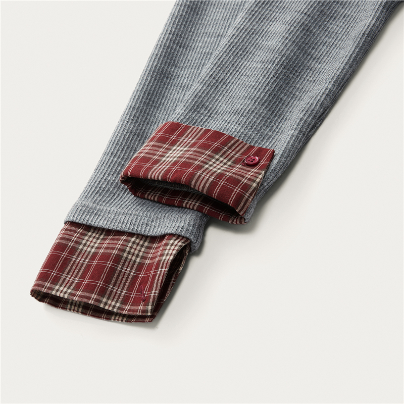 【網上獨家】女裝假兩件針梭織拼接格紋圓領外套