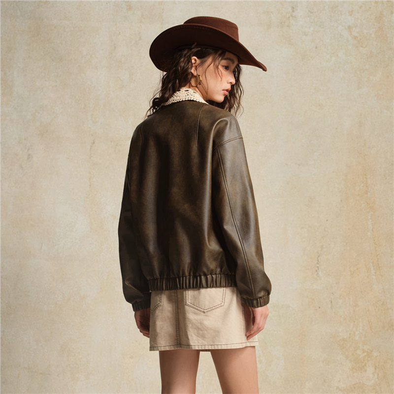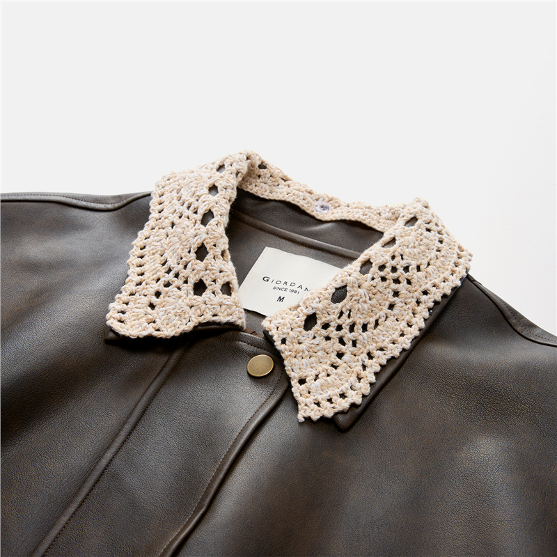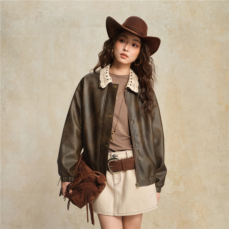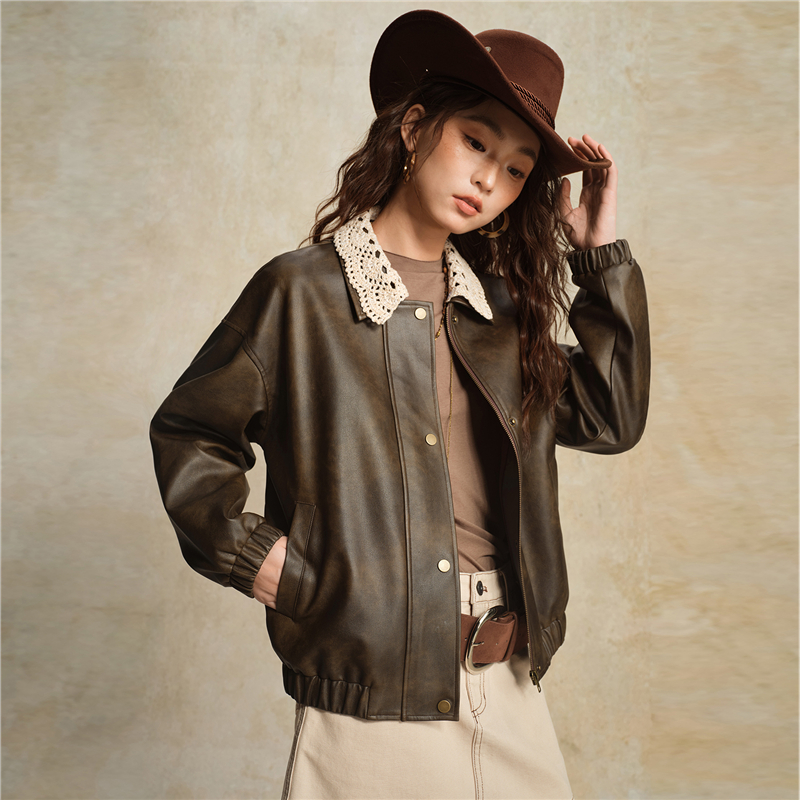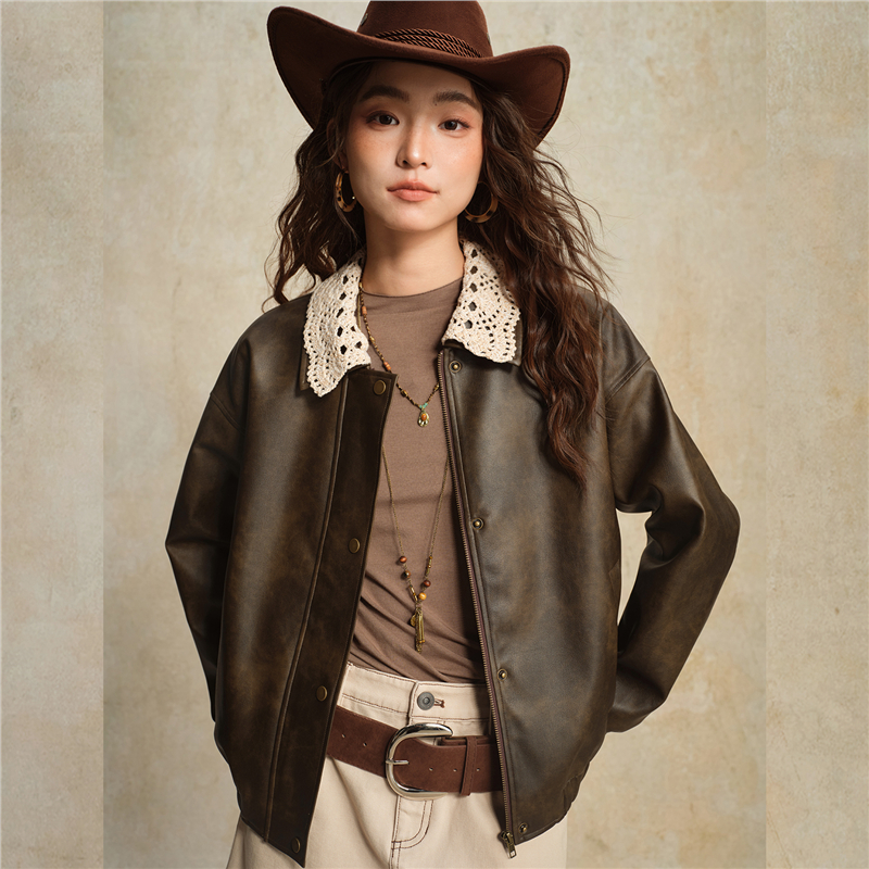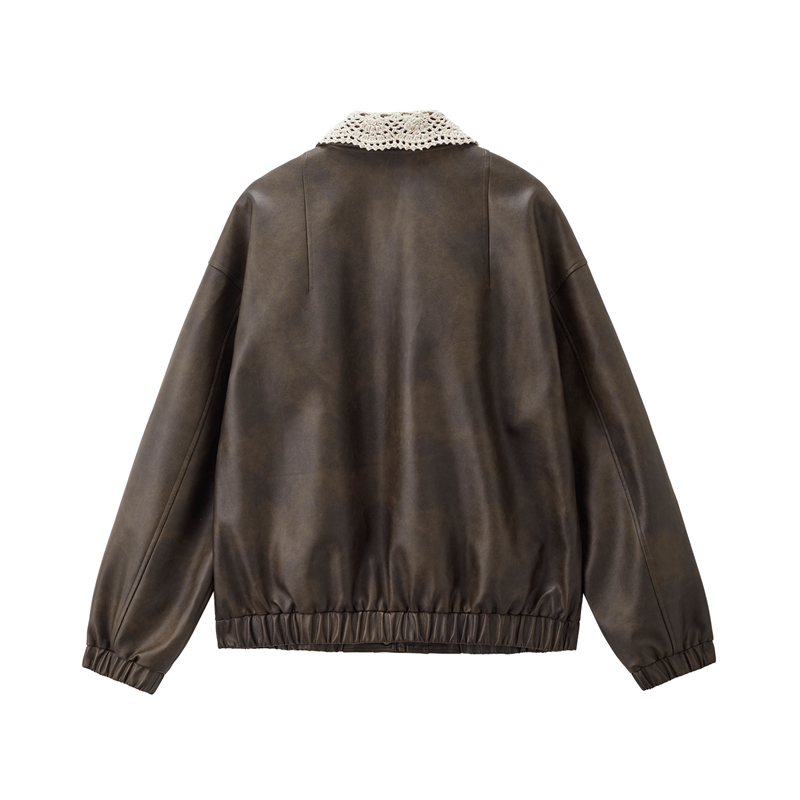 複古擦色皮革,光澤有質感 拼接蕾絲翻領,輕鬆拆卸,造型多變 拉鏈門襟,加設防風片,不易入風。