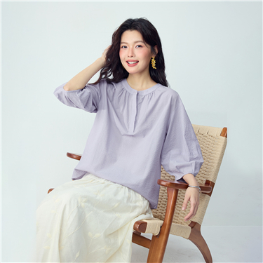 Seersucker half placket 3/4 sleeve blouse