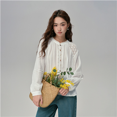 【網上獨家】女裝拼接蕾絲圓領插肩長袖襯衫