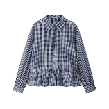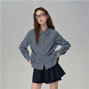 【網上獨家】女裝純棉格紋花邊下擺長袖襯衫