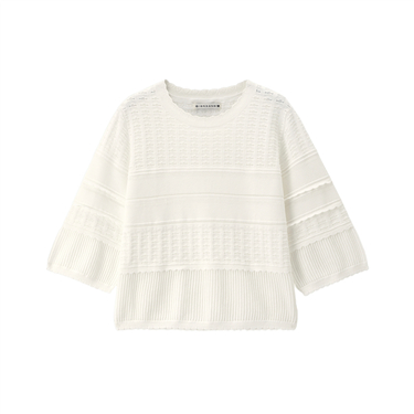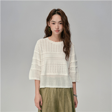 【網上獨家】女裝純棉鏤空提花七分袖套頭針織衫