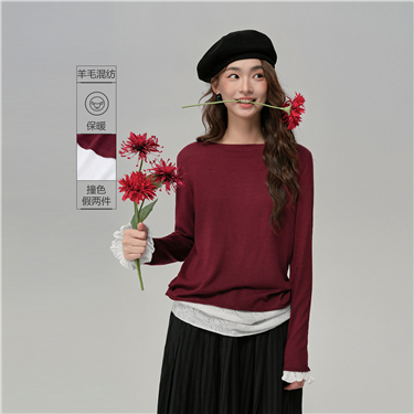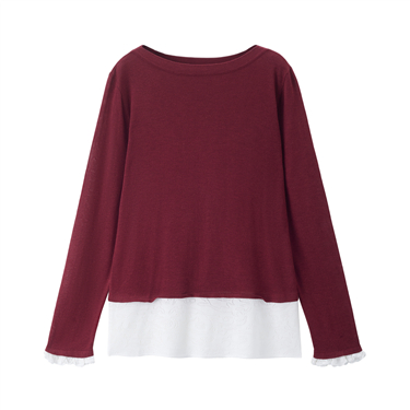 【網上獨家】女裝假兩件拼接蕾絲花邊圓領長袖T恤