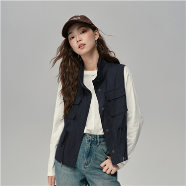 【網上獨家】女裝工裝口袋立領可收腰背心外套