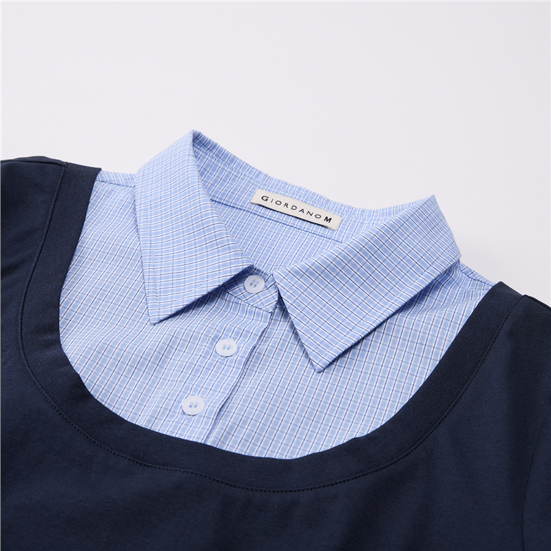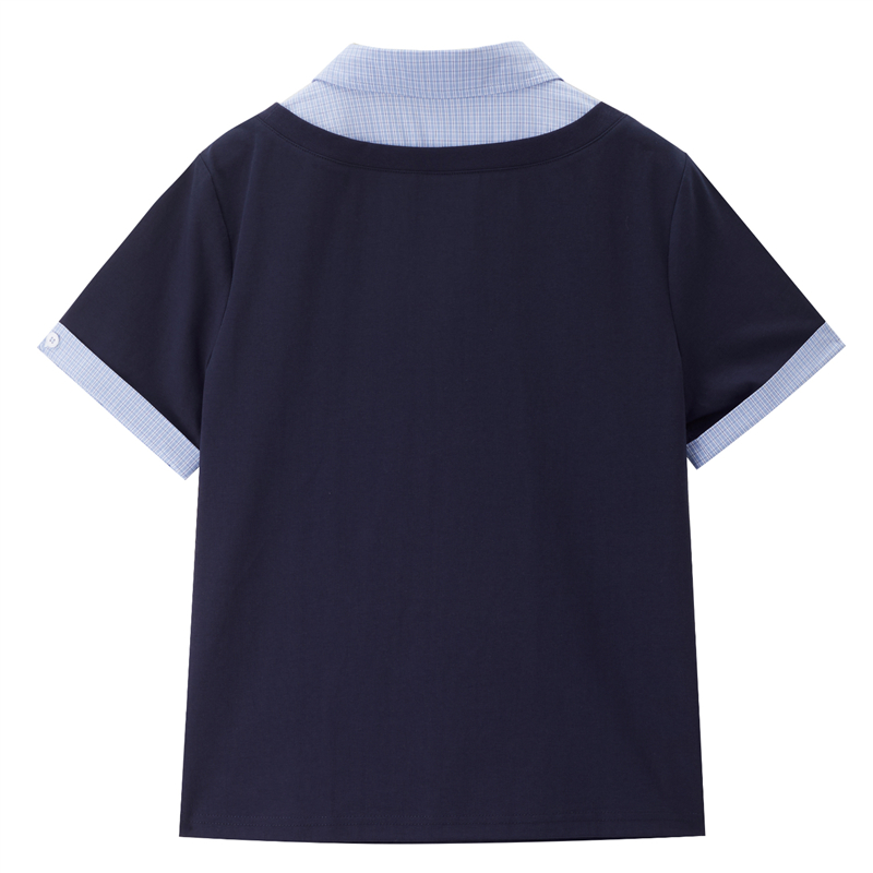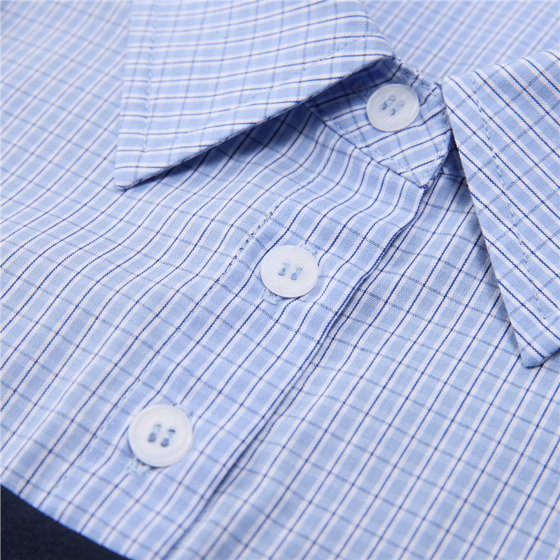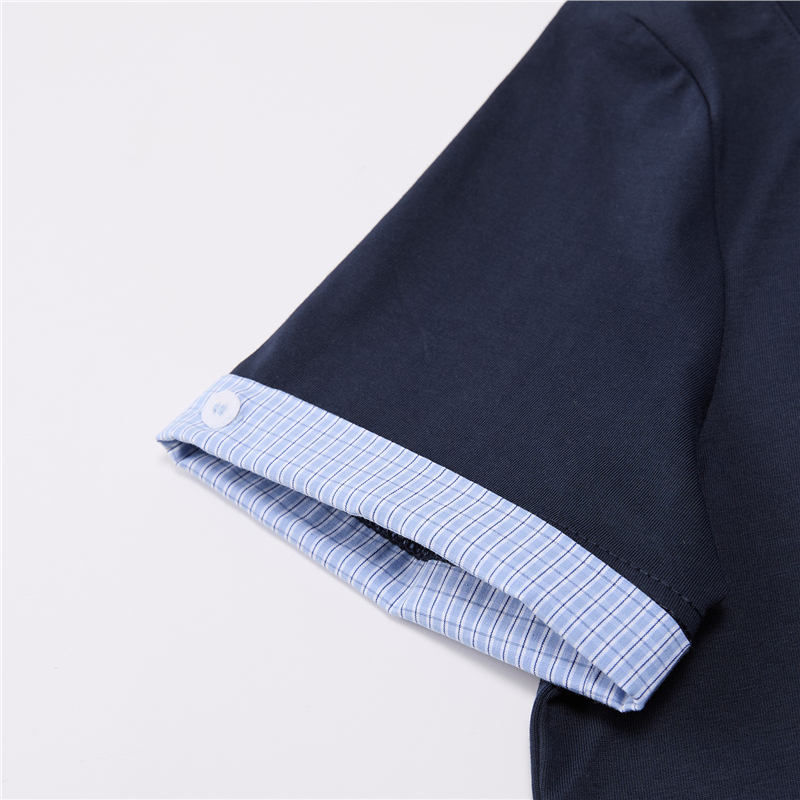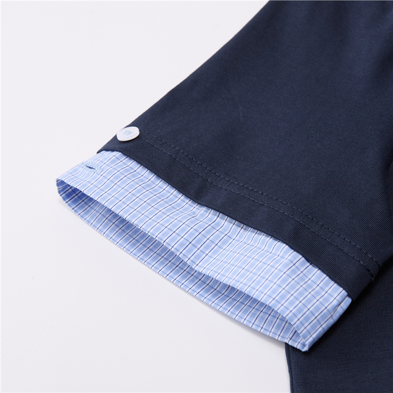 爽滑針織布拼接格紋假兩件,時髦舒適;假兩件翻領,干凈利落,工整美觀;紐扣半開襟,結實牢固,穿脫方便。