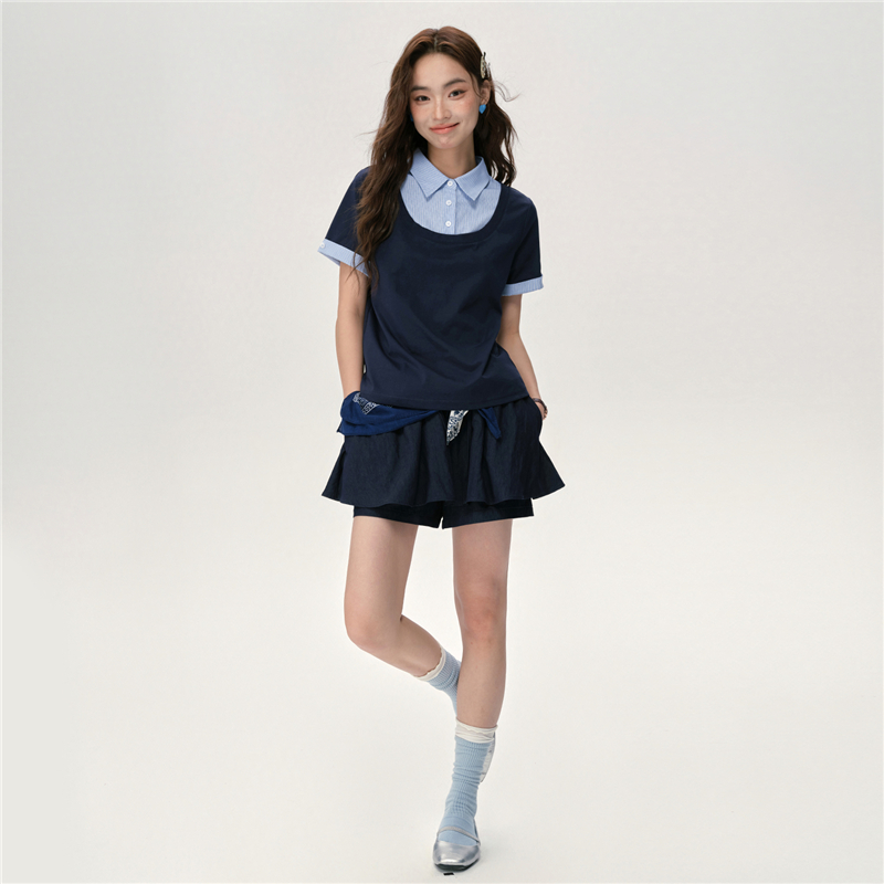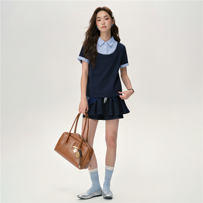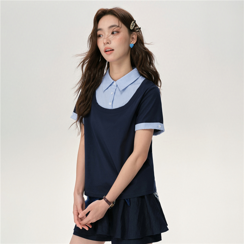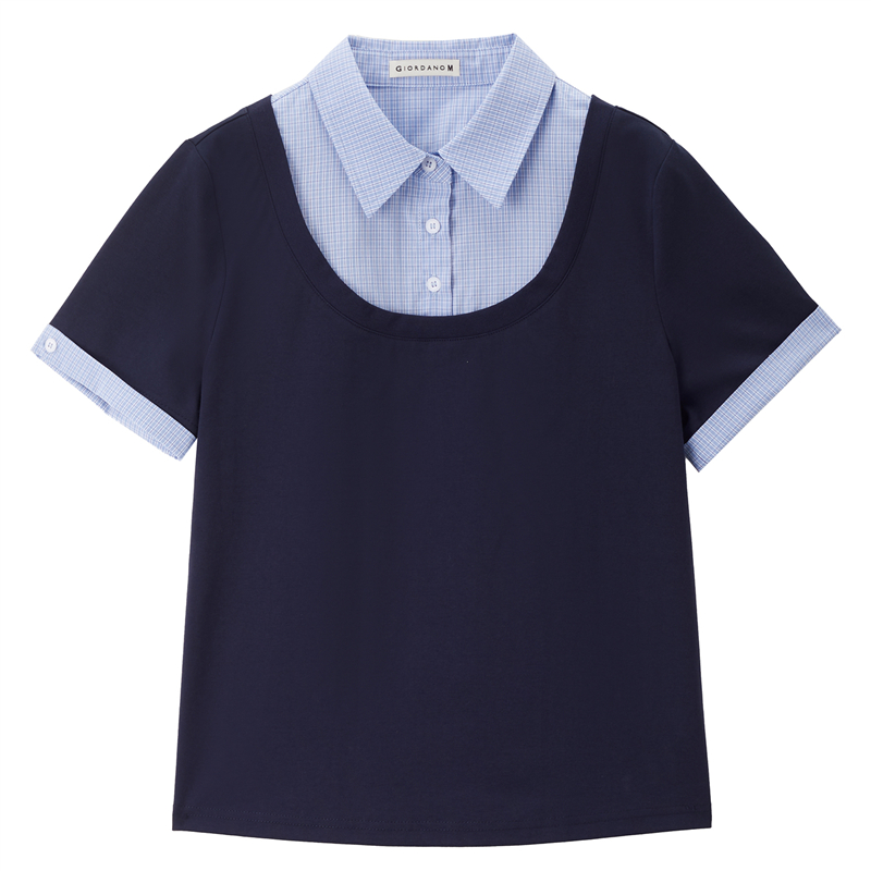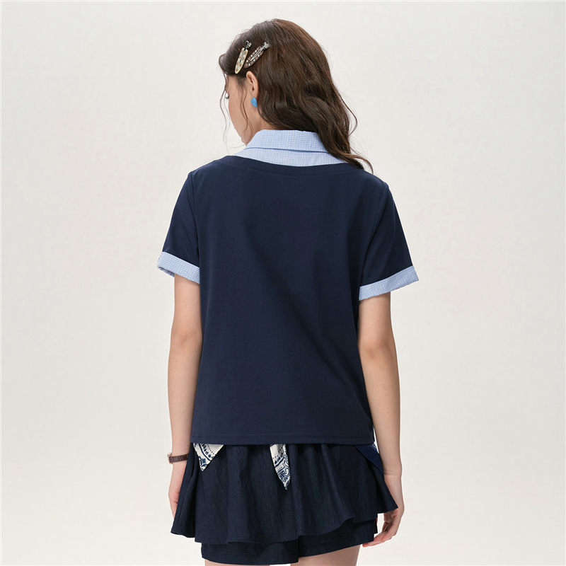 爽滑針織布拼接格紋假兩件,時髦舒適;假兩件翻領,干凈利落,工整美觀;紐扣半開襟,結實牢固,穿脫方便。