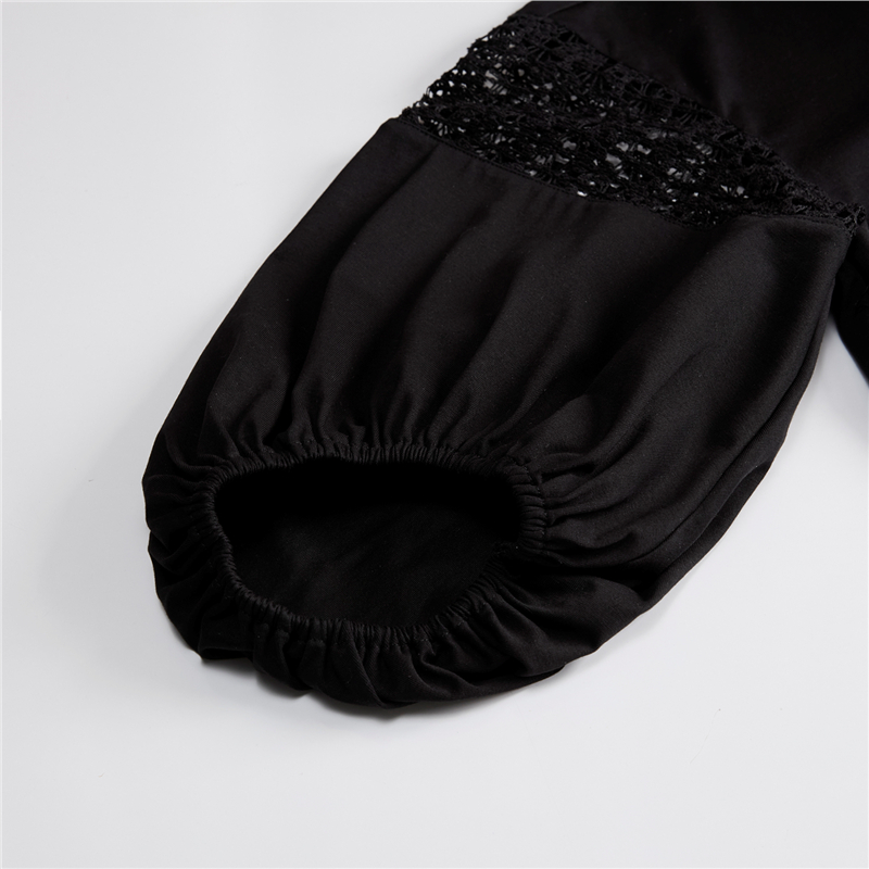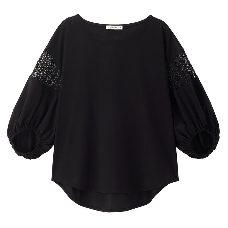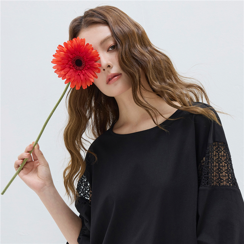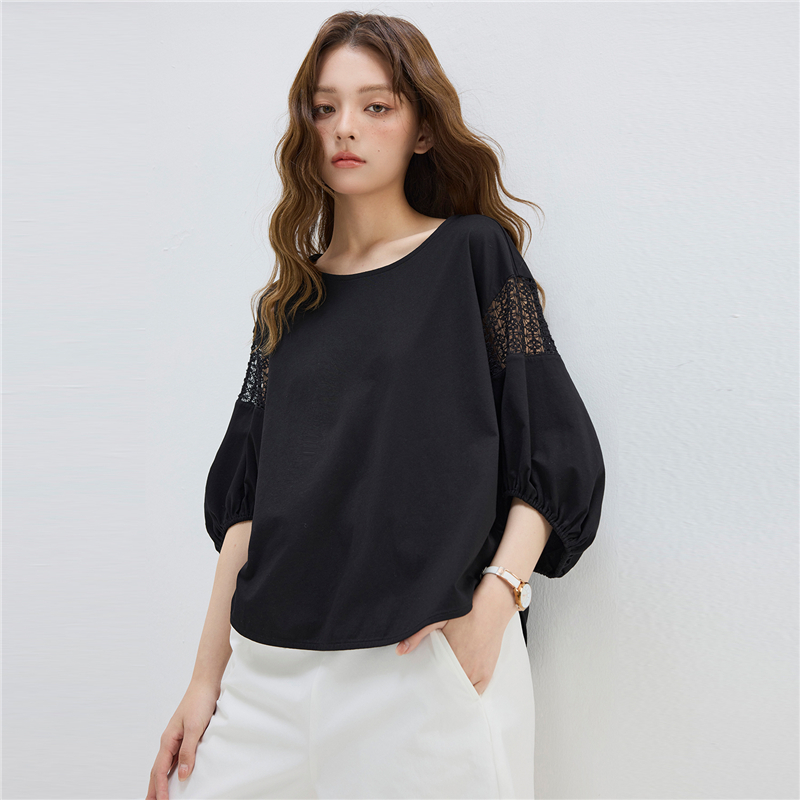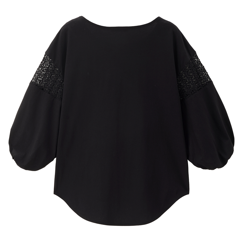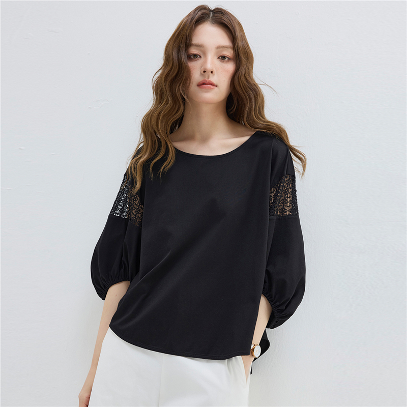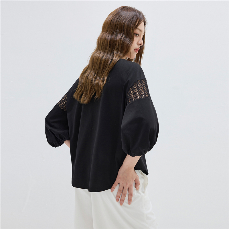 【網上獨家】女裝圓領鏤空燈籠中袖弧形下擺針織T恤