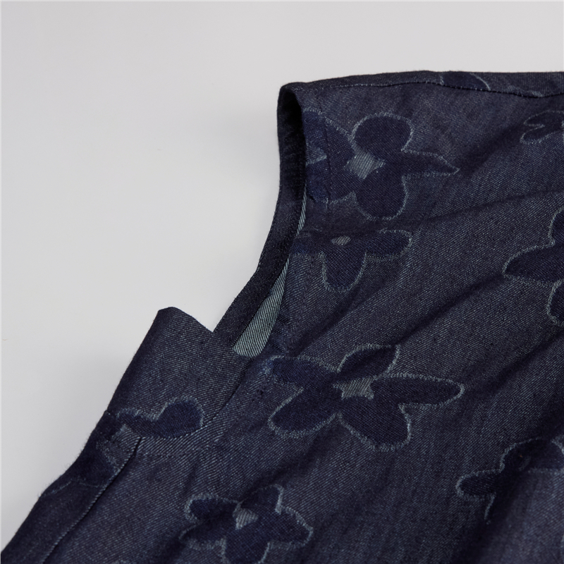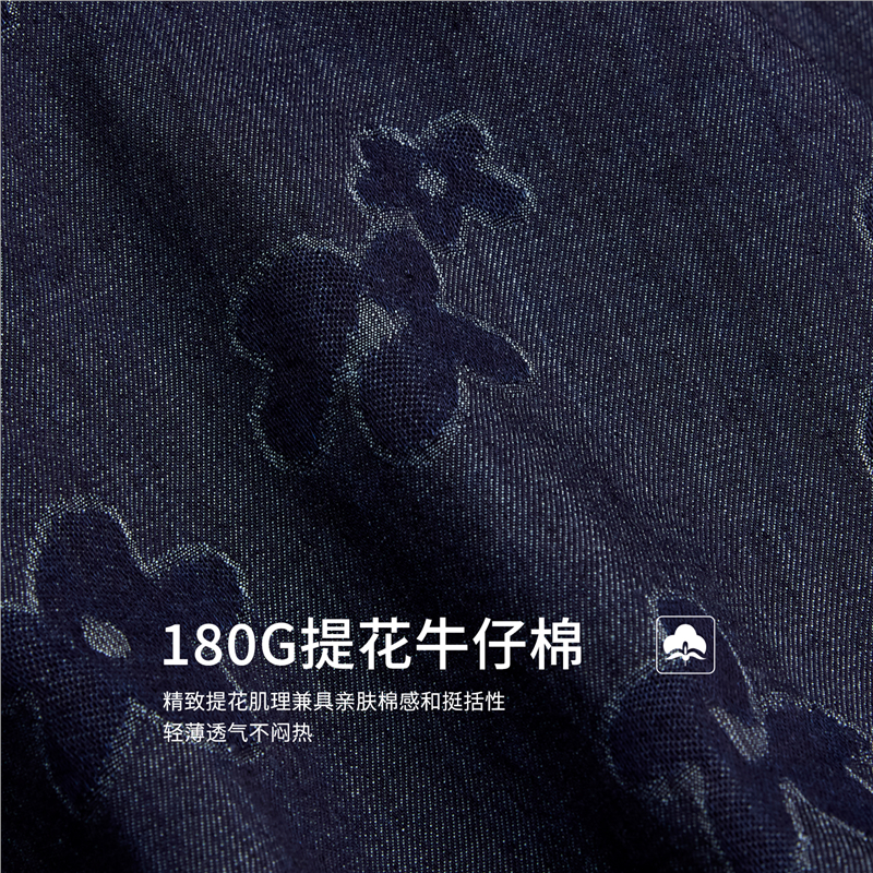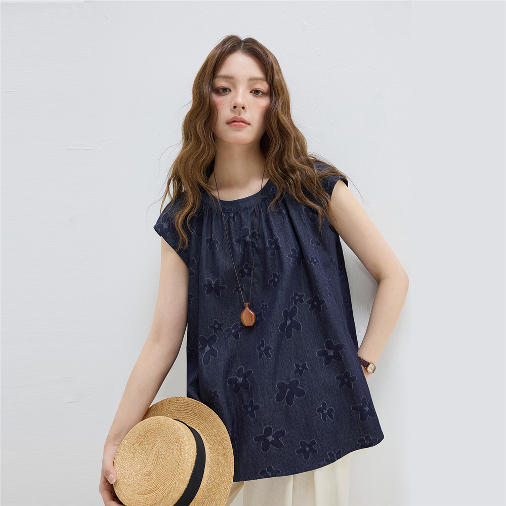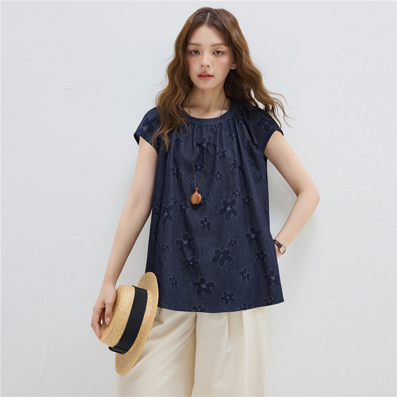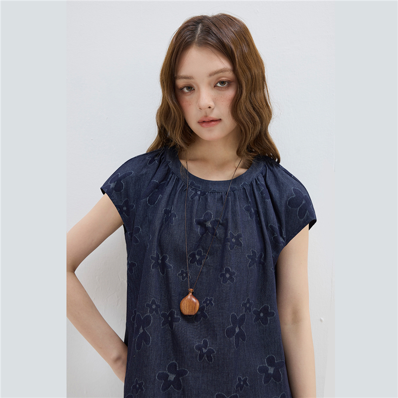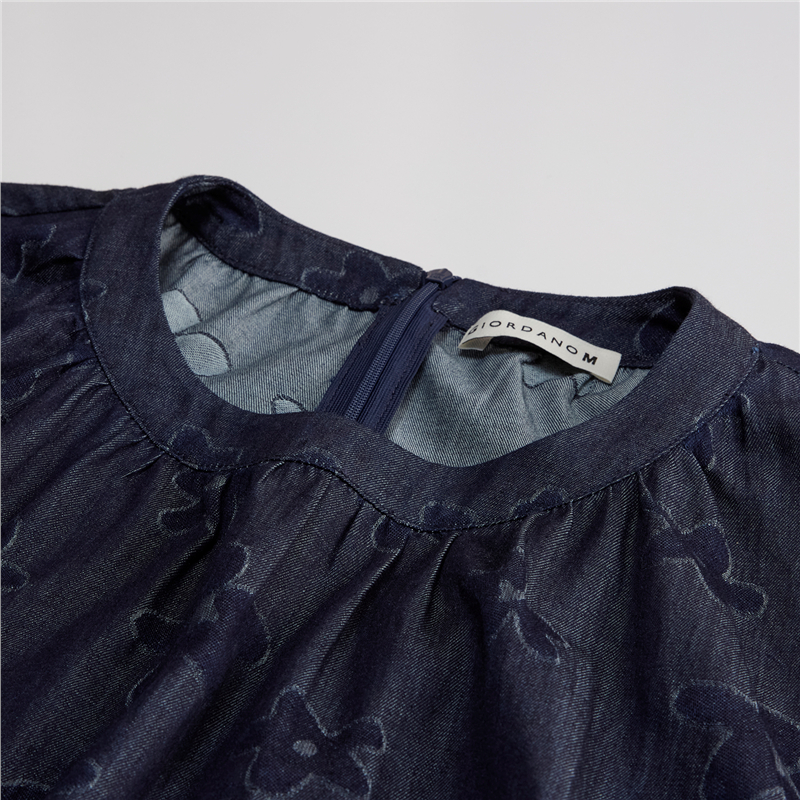 【網上獨家】女裝純棉提花牛仔圓領小飛袖中長款襯衫
