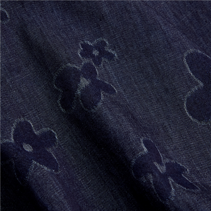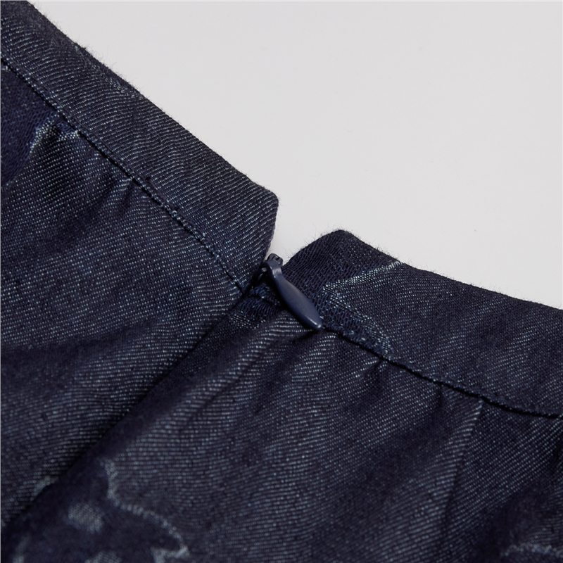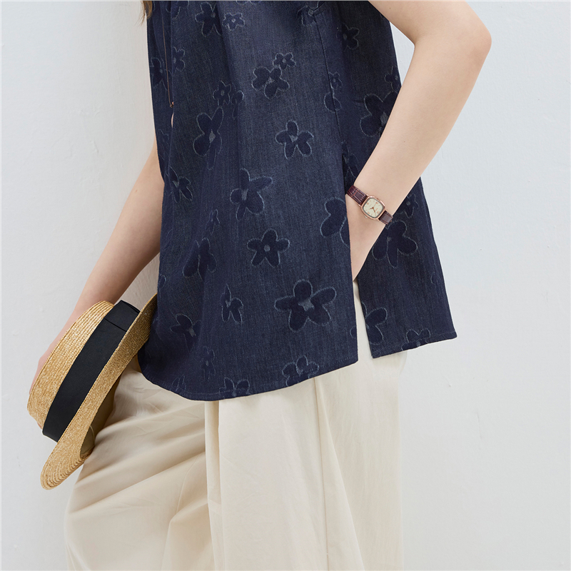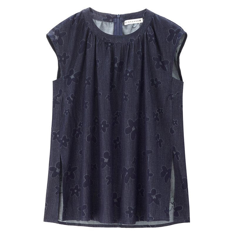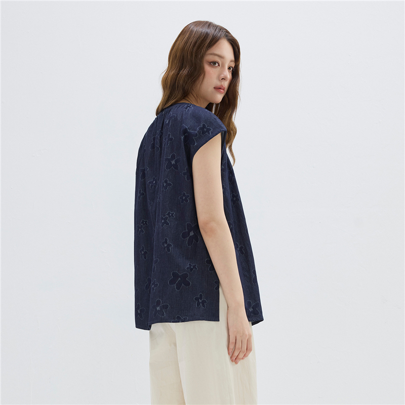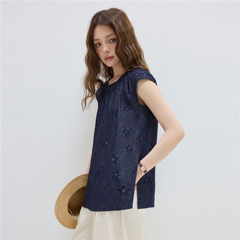 【網上獨家】女裝純棉提花牛仔圓領小飛袖中長款襯衫