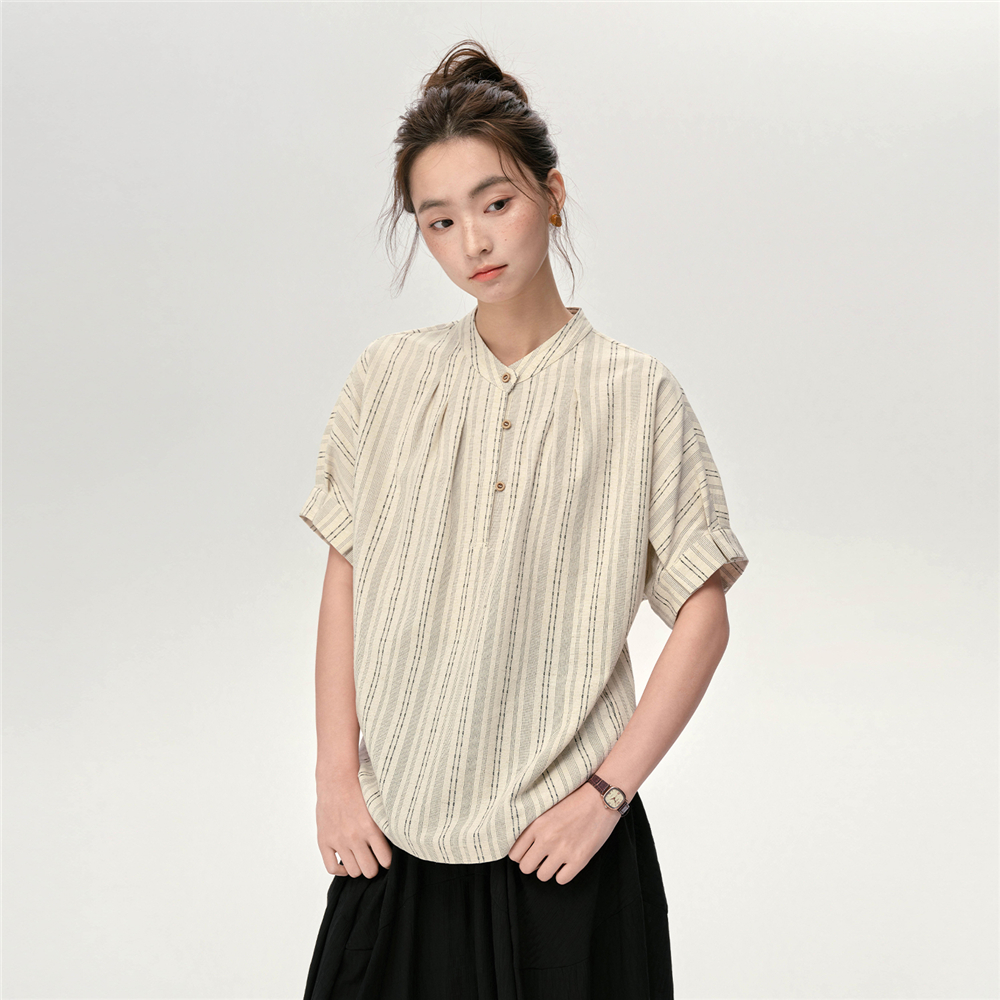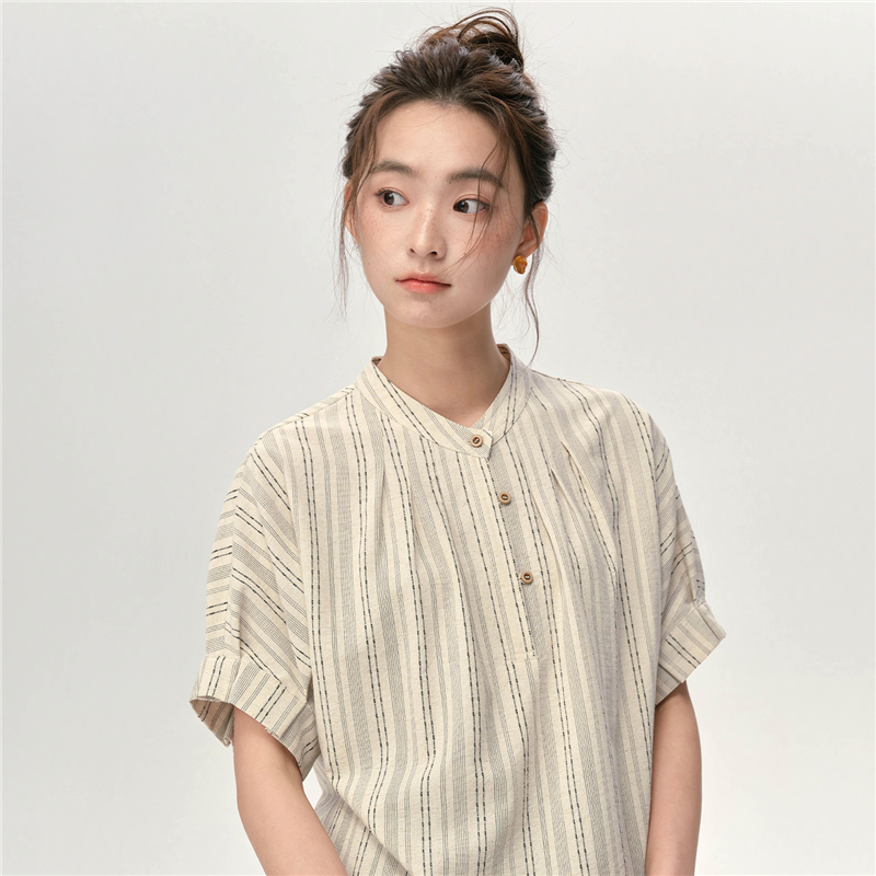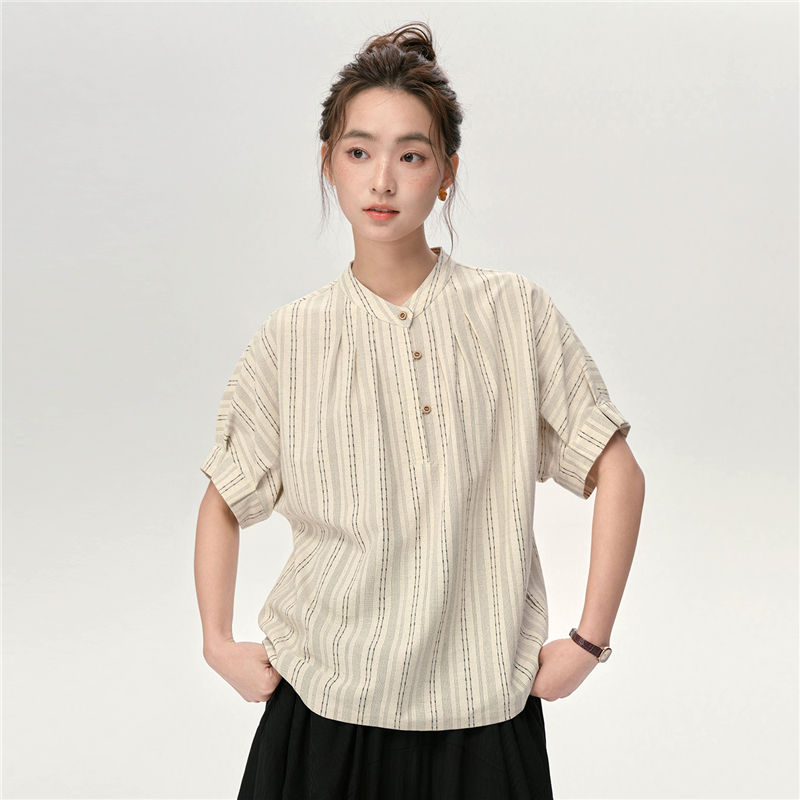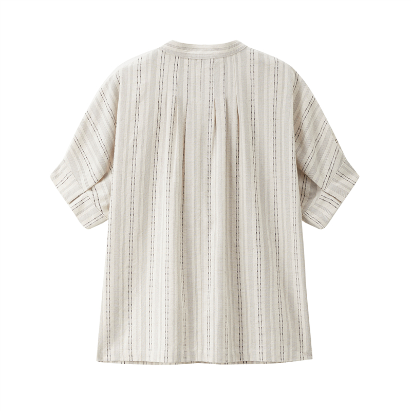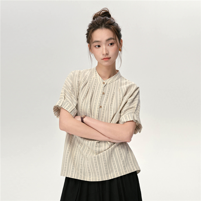 【網上獨家】女裝條紋仿麻小立領半開襟花邊短袖襯衫