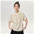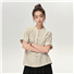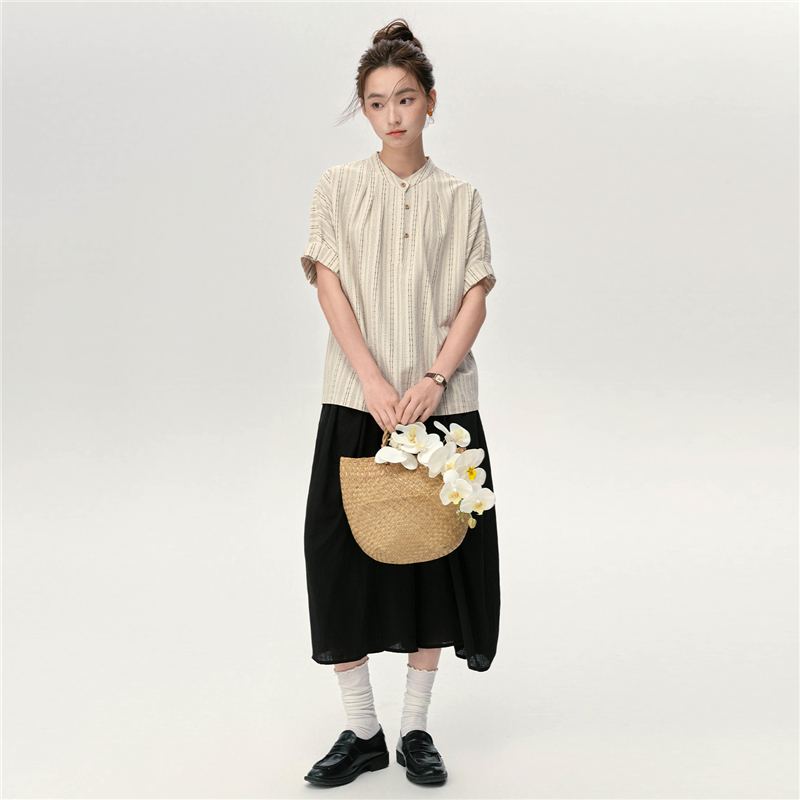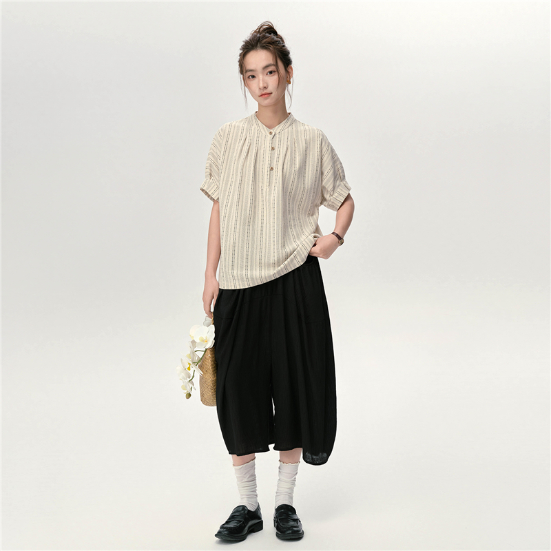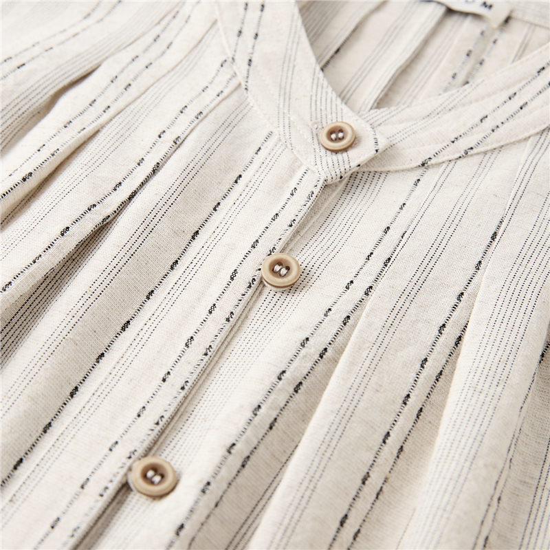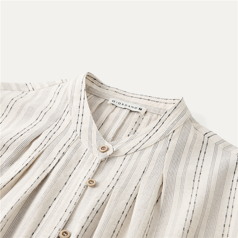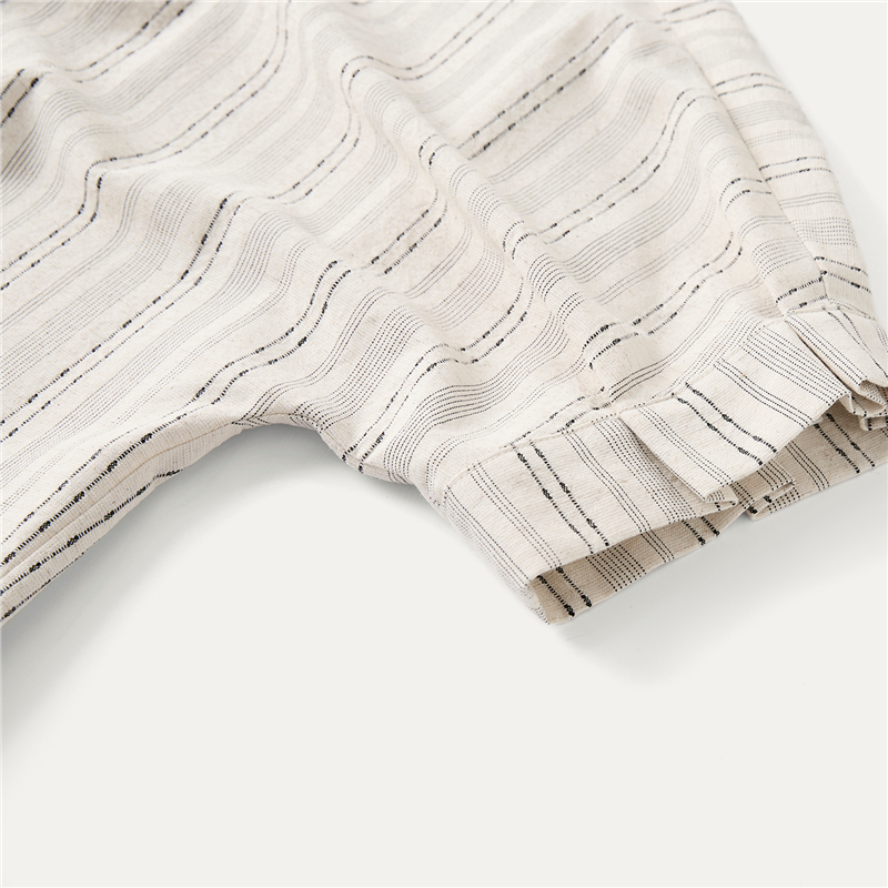 【網上獨家】女裝條紋仿麻小立領半開襟花邊短袖襯衫