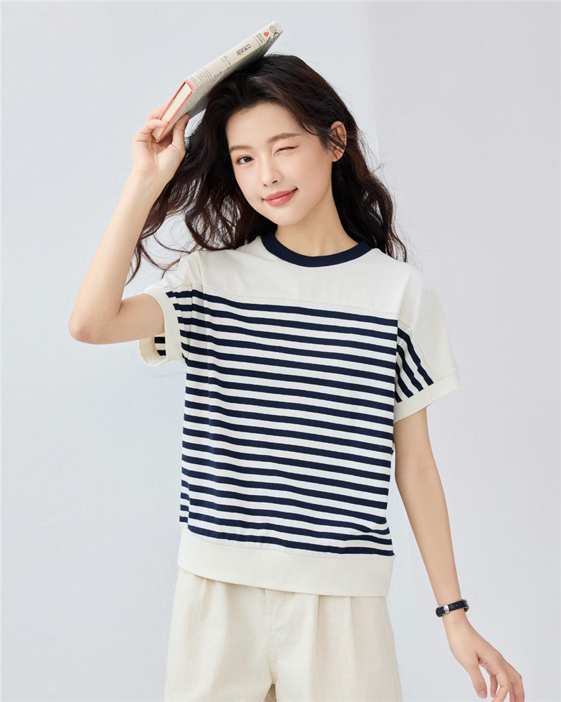 女裝條紋圓領插肩短袖襯衫