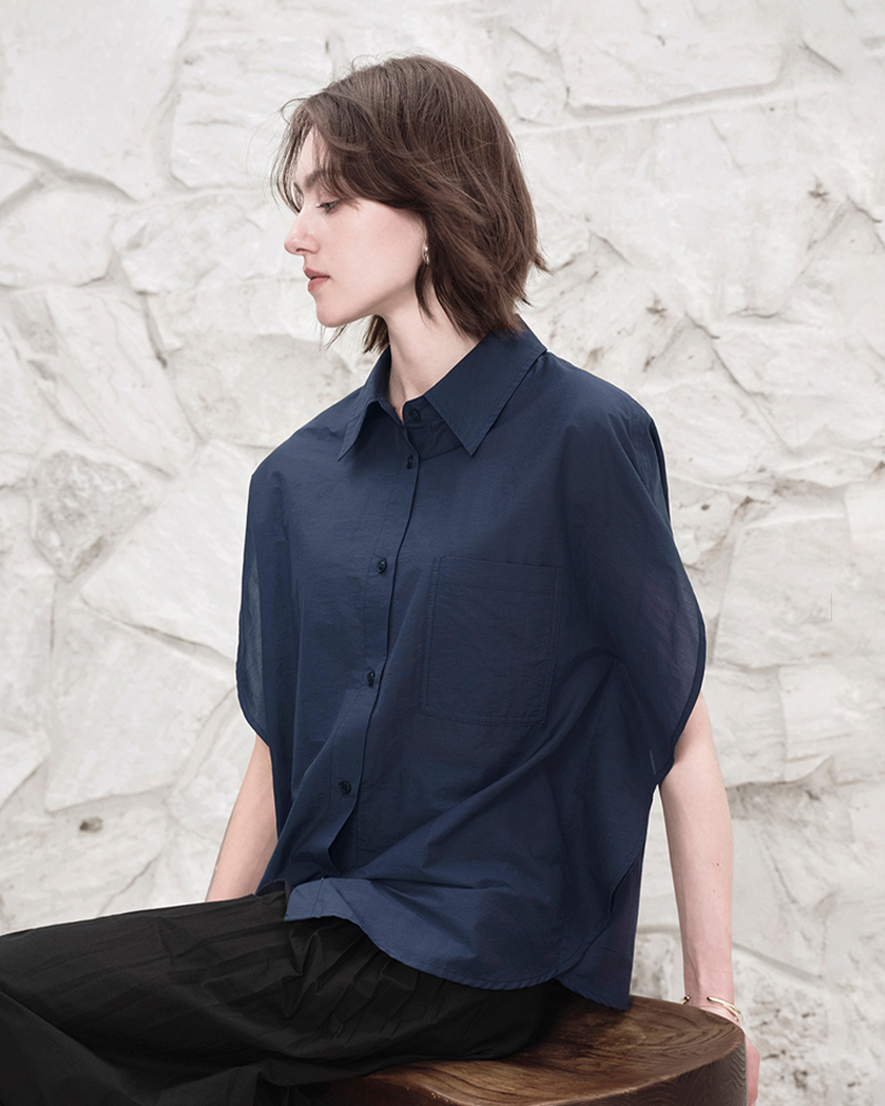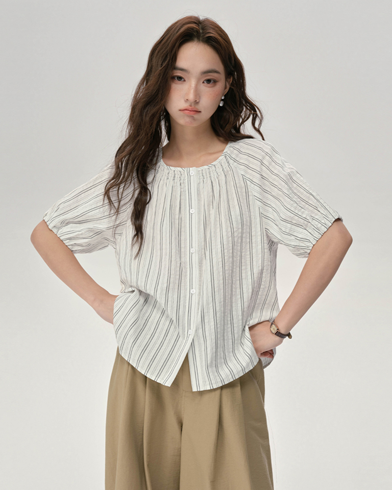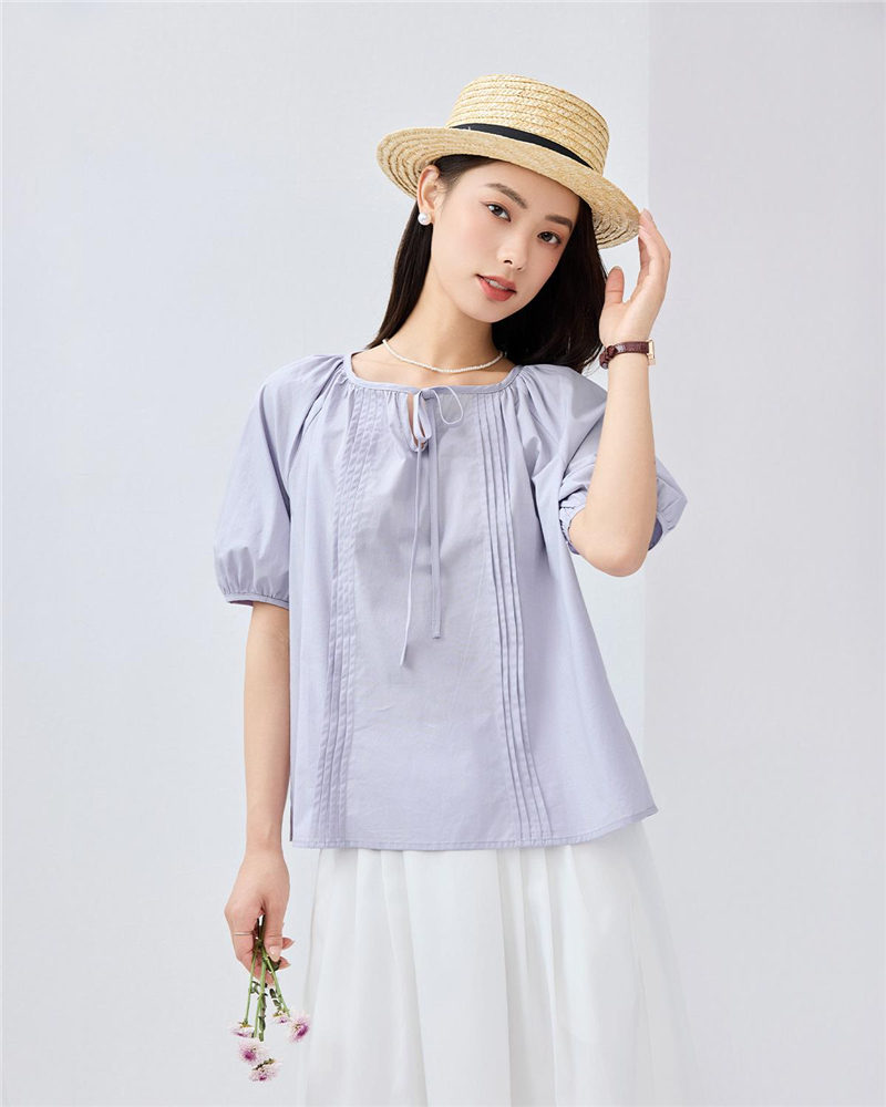 BM女裝圓領壓褶插肩短袖襯衫
