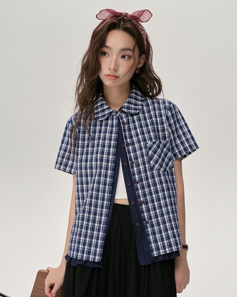 女裝格紋荷葉邊下擺短袖襯衫